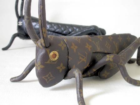 「バッタもん」は、バッタの姿をした40センチほどの立体作品。ルイ・ヴィトンなど5社のロゴマークや柄を使った9体が、4月15日から6月27日まで開かれた「ファッション奇譚」展に展示された。